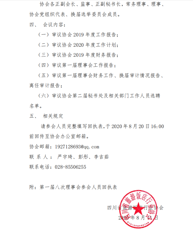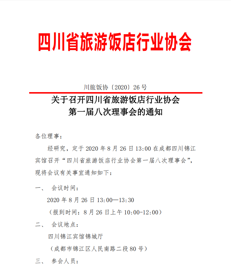 关于召开四川省旅游饭店行业协会第一届八次理事会的通知